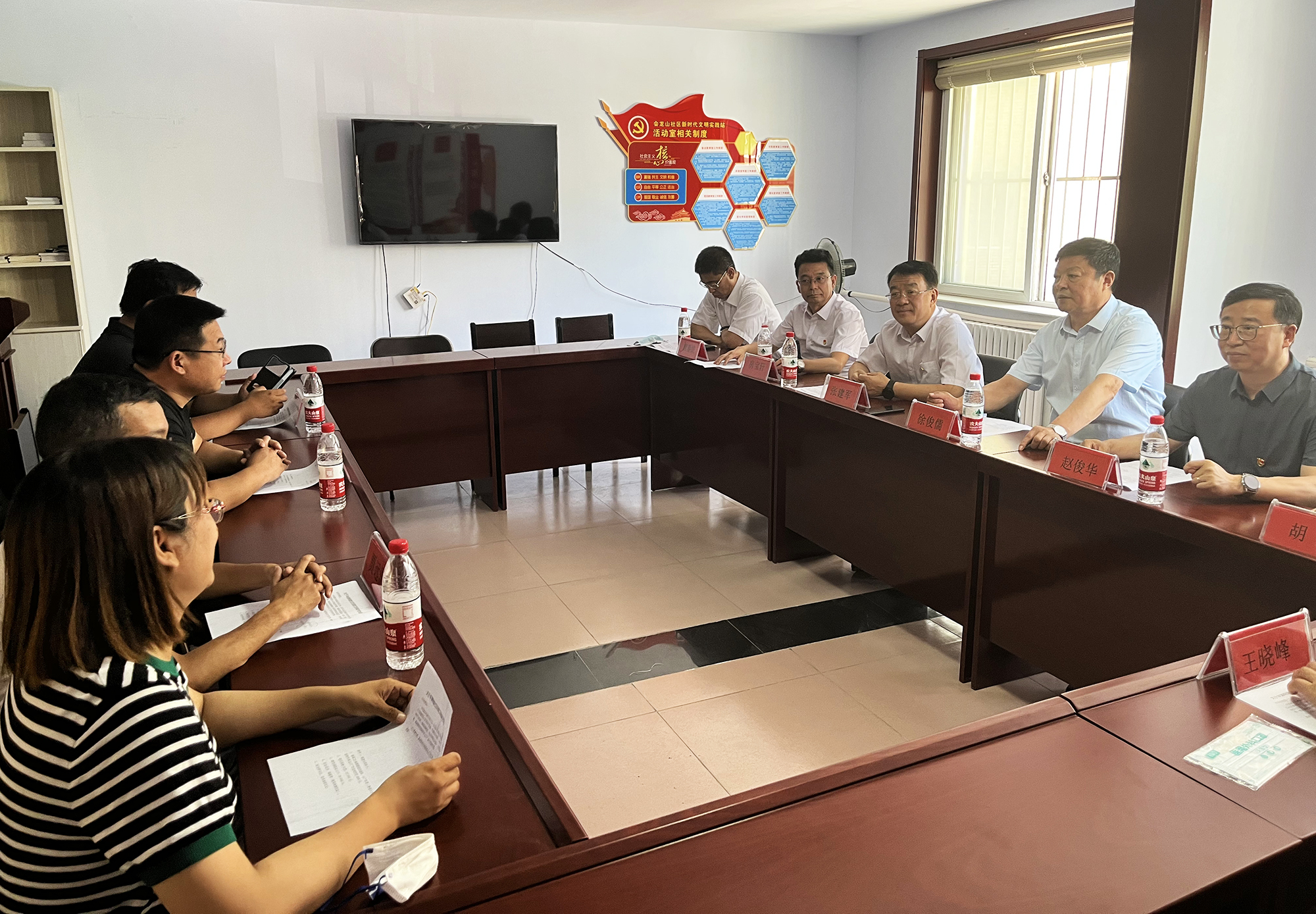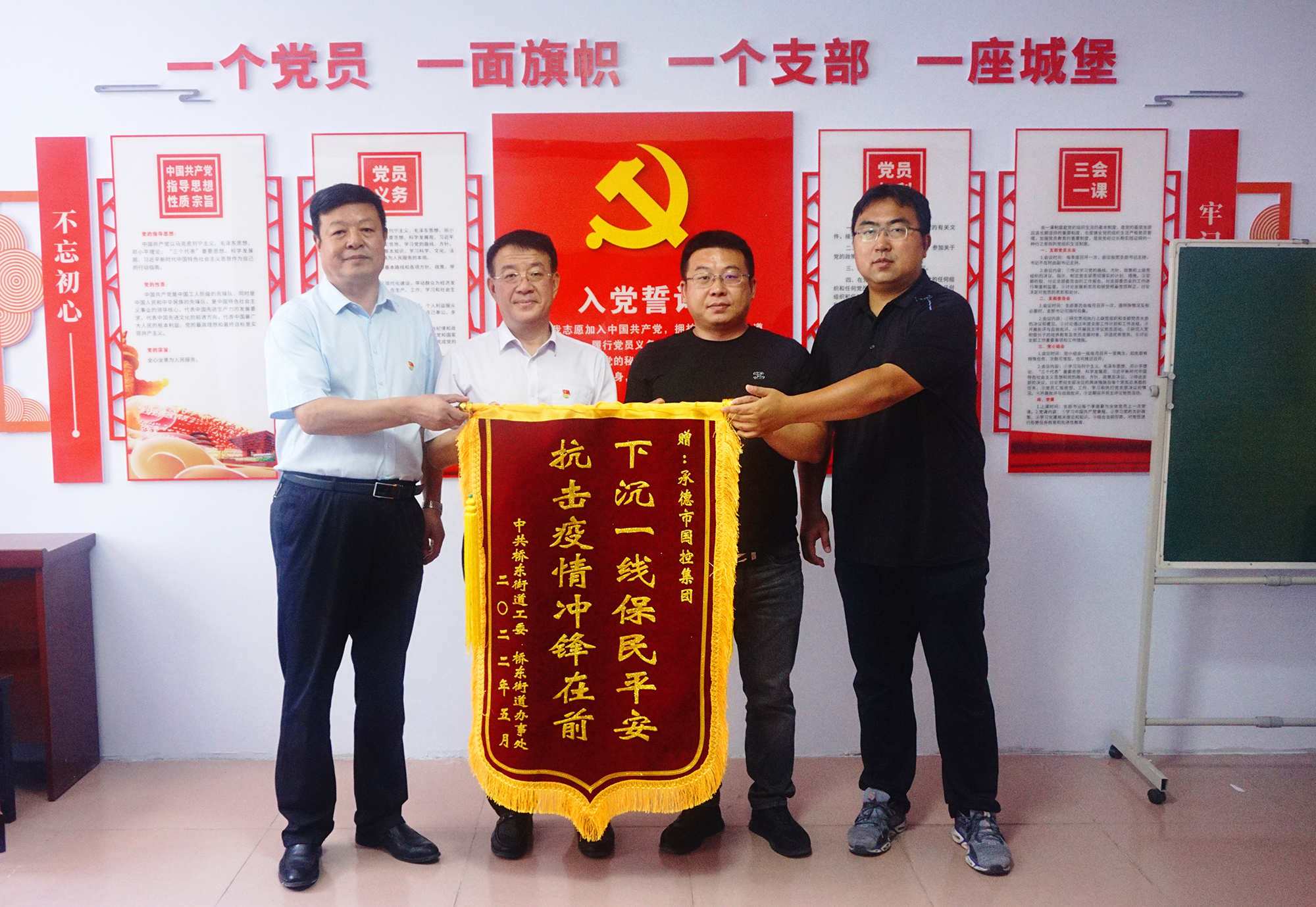 捐贈儀式后,國控集團領導班子與橋東街道、會龍山社區(qū)主要負責人,就結對幫建工作進行座談,詳細了解了創(chuàng)城工作開展情況、存在問題及下一步打算,針對社區(qū)基礎設施不完善、公共停車泊位施劃不合理、樓道雜亂和小廣告亂貼等問題,研究制定了具體舉措。會上,為感謝國控集團在抗擊疫情和結對幫建工作中的大力支持,橋東街道、會龍山社區(qū)向集團公司贈送了“下沉一線保民平安、抗擊疫情沖鋒在前”錦旗。