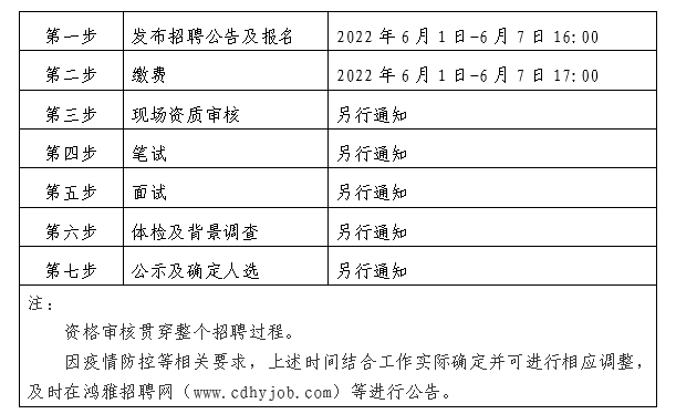 2022年6月1日至2022年6月7日16:00 在鴻雅招聘網(wǎng)(http://www.cdhyjob.com/)、鴻雅微信公眾號、國控集團官方網(wǎng)站(http://m.hahdfk.cn/)及上級部門要求的相關(guān)網(wǎng)站等發(fā)布招聘公告。