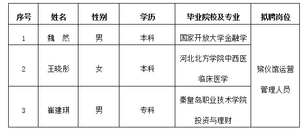 因公司發(fā)展需要,承德市國(guó)瑞置業(yè)有限公司委托第三方機(jī)構(gòu)面向社會(huì)公開(kāi)招聘殯儀館運(yùn)營(yíng)管理人員3名?,F(xiàn)對(duì)擬錄用人員信息進(jìn)行公示,公示期間如有異議,可通過(guò)電話(huà)、信函等方式反映,反映意見(jiàn)請(qǐng)署真實(shí)姓名。