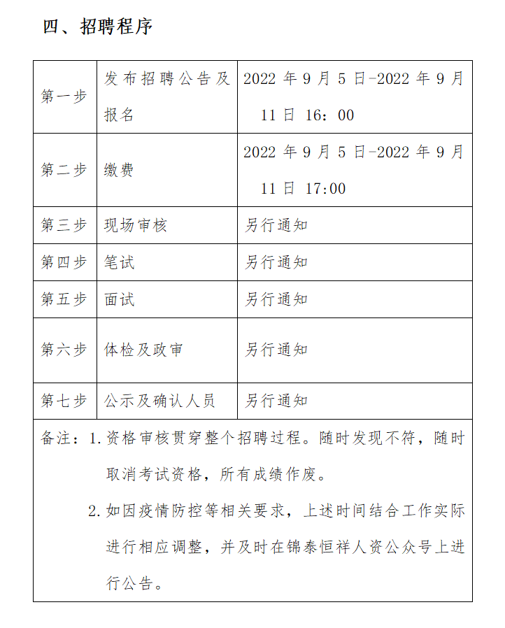 ?2022年9月5日-2022年9月11日16:00 在錦泰恒祥人資官網(wǎng)(www.jthxhr.com)、“錦泰恒祥人力資源服務(wù)有限公司”微信公眾號(hào)、“國(guó)控集團(tuán)”官方網(wǎng)站(m.hahdfk.cn)及上級(jí)部門(mén)要求的相關(guān)網(wǎng)站等發(fā)布招聘公告。