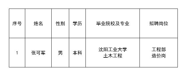 因公司發(fā)展需要,承德市國(guó)越房地產(chǎn)開發(fā)有限公司委托第三方機(jī)構(gòu)面向社會(huì)公開工程部造價(jià)崗員工1名?,F(xiàn)對(duì)擬錄用人員信息進(jìn)行公示,公示期間如有異議,可通過電話、信函等方式反映,反映意見請(qǐng)署真實(shí)姓名。