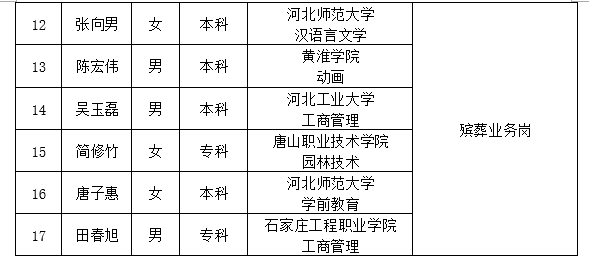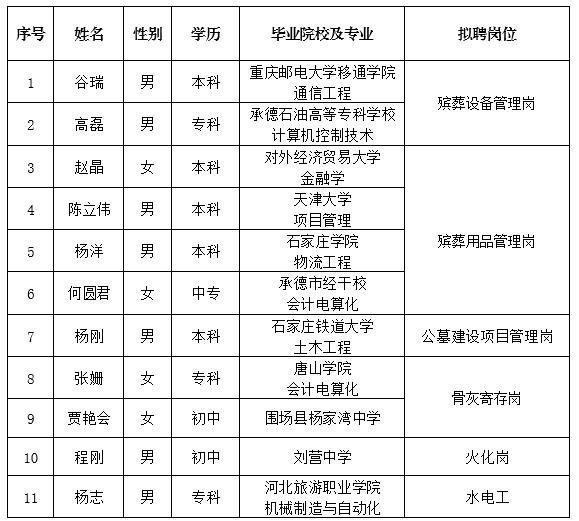 因公司發(fā)展需要,承德市國瑞置業(yè)有限公司委托第三方機(jī)構(gòu)面向社會公開招聘殯儀館運(yùn)營各崗位人員17名?,F(xiàn)對擬錄用人員信息進(jìn)行公示,公示期間如有異議,可通過電話、信函等方式反映,反映意見請署真實姓名。