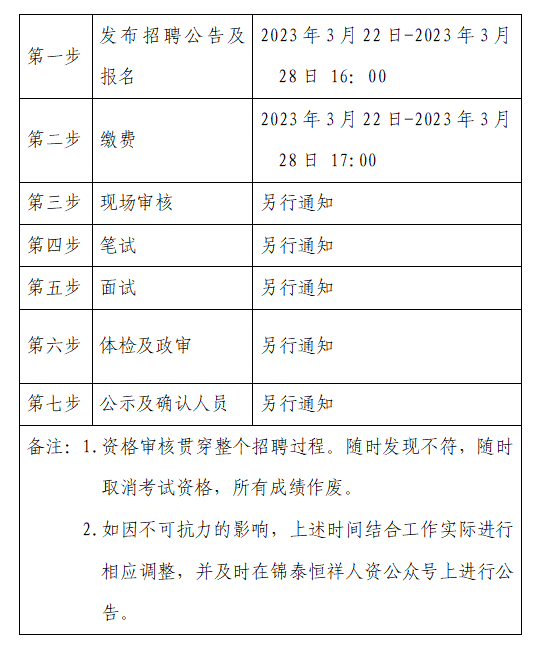 2023年3月22日-2023年3月28日 ?16:00在錦泰恒祥人資官網(wǎng)(www.jthxhr.com)、“錦泰恒祥人資”微信公眾號(hào)、“國(guó)控集團(tuán)”官方網(wǎng)站(m.hahdfk.cn)及上級(jí)部門(mén)要求的相關(guān)網(wǎng)站等發(fā)布招聘公告。