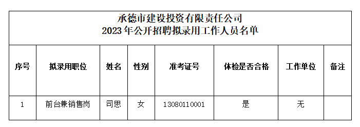 根據(jù)2023年度承德市建設(shè)投資有限責(zé)任公司公開招聘工作人員的相關(guān)要求,經(jīng)過筆試、面試、體檢和考察等程序,確定司思同志為承德市建設(shè)投資有限責(zé)任公司擬錄用工作人員,現(xiàn)予以公示。公示期間如有異議,可通過電話、信函等方式反映,反映意見請署真實(shí)姓名。